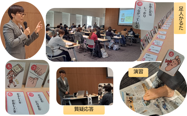 講義では、「なぜ、いま足なのか」、「足状態はこんなことで変わる」ということについてお話がありました。冒頭で「足の寿命は50年」と切り出され、驚きと共に一気に惹きつけられました。足の健康は全身の健康と密接に関係しており、姿勢とバランスの維持、歩行・運動機能の維持、血流・神経系・免疫系、そして認知機能やメンタルヘルスなどにも影響することを、データや実例を示しながら具体的に説明いただきました。また、「介護が必要になる原因は色々だが、それらの原因の72.5%は運動で予防や悪化予防が可能である」と、予防的視点の重要性についてお話がありました。より良い状態の足にするためにおウチでできるフットケアとして、足の洗い方、保湿の方法、爪の切り方、そして靴の履き方や脱ぎ方などについて教えて頂きました。靴を履く際のつま先トントンはNG、足首90度で踵トントンして踵を合わせるようにとのことでした。また足を動かすことのメリット、得られる成果について、足のもみほぐしや、グーチョキパー、新聞紙の手繰り寄せなどを皆で体験しました。「難しい」、「気持ちいい」などと口にしながら、楽しそうな雰囲気で演習されていました。日頃の支援の中で「靴下脱げるかな」、「自分の爪切れるのかな?」といった利用者さんの様子を観察し、フットケアをケアプランに繋げてほしいというお話もありました。そして、足のことを話題に挙げて関心を持ってほしいと力強く話されていました。